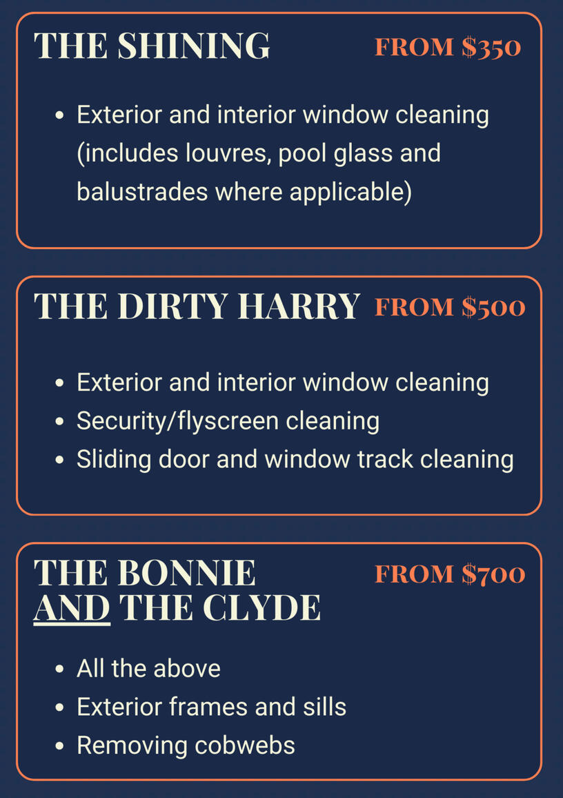 Window, balustrade and pool fence cleaning is our main jam. We also offer optional track and screen cleaning.And we often wear only the fanciest socks when doing so.
