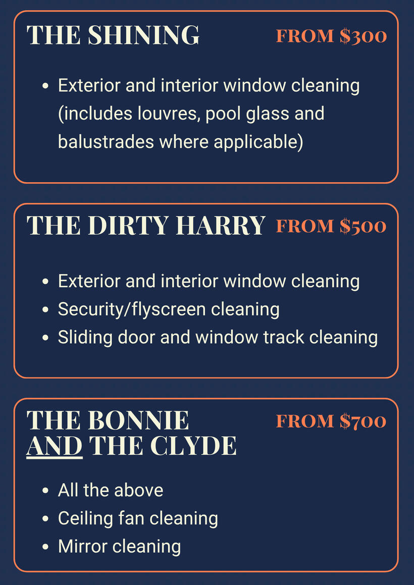 We service customers between Gordonvale and Port Douglas, including Kuranda.Selling your house, hosting a wedding, or having a Bonanza-themed Thermomix party?Or maybe your school, daycare or body corporate could use a bit of squeegee slinging?Don't let dirty windows spoil the vibe.We use the latest window cleaning equipment and can reach windows up to 14 meters from the ground without a boom lift or scaffolding.Let us clean your windows so you can party like it's 1968. By the time we're done, staring through those windows will make you question reality.